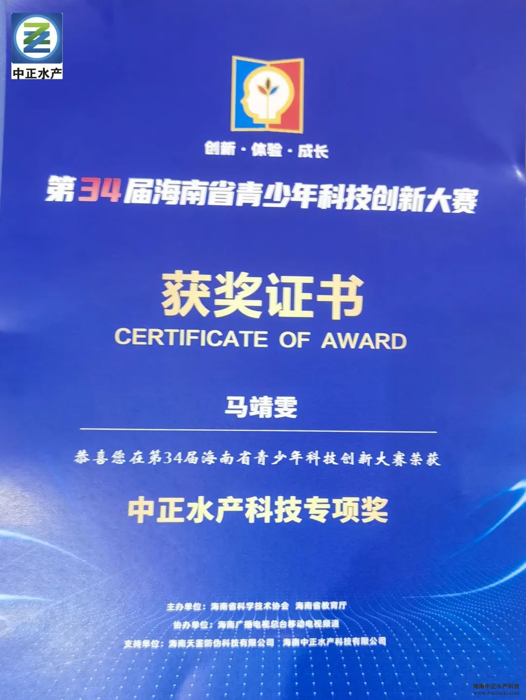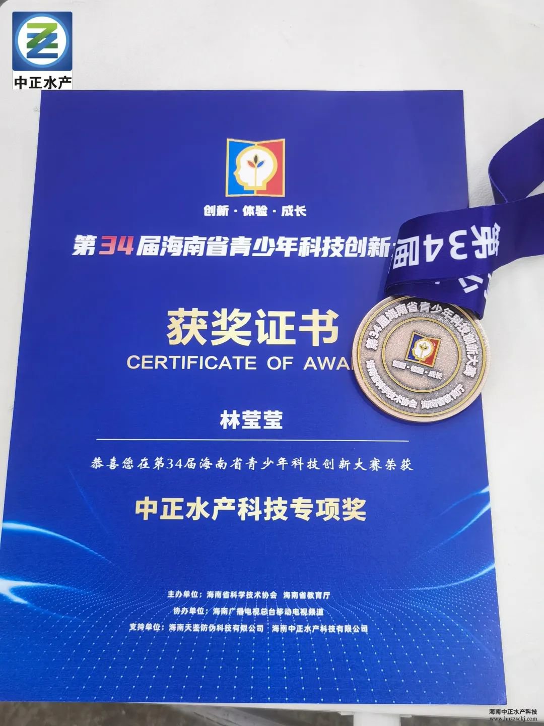 11月20日,在第34屆海南省青少年科技創新大賽頒獎活動中,海南中正水產科技有限公司總裁雷秋涼和海南省科學技術廳副廳長王敏,共同為獲獎的同學頒發“中正水產科技專項獎”獎牌和證書,并合影留念。