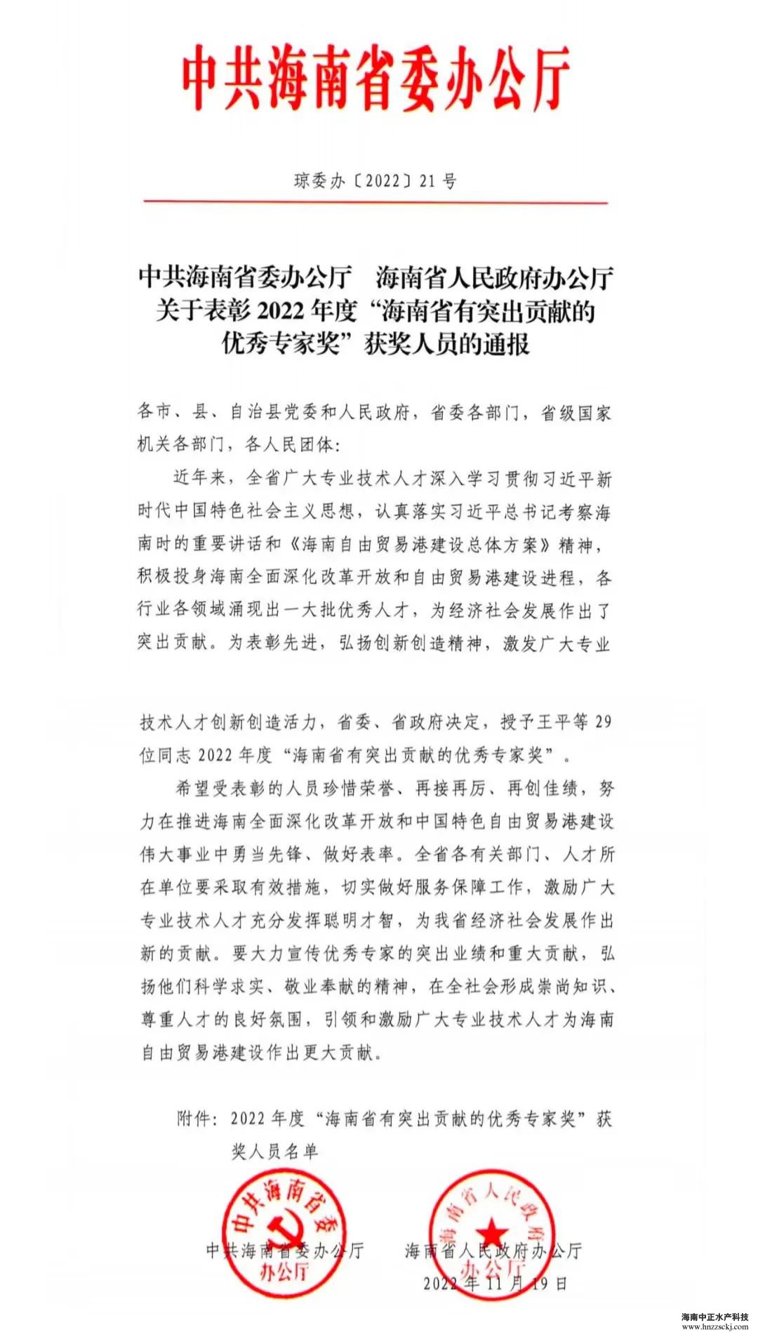 其中,海南中正水產科技有限公司副總裁王平同志榮獲“海南省有突出貢獻的優秀專家獎”表彰。